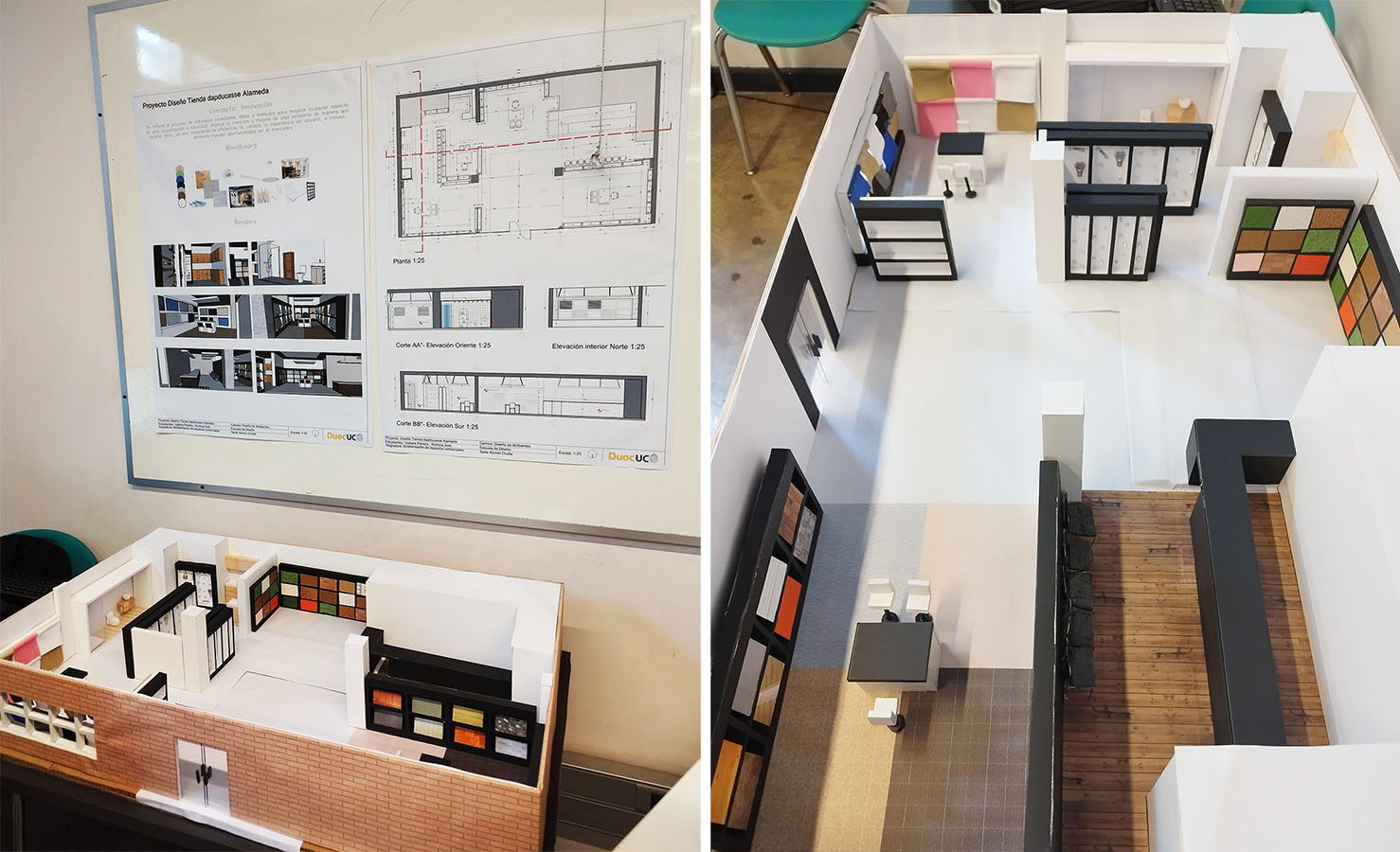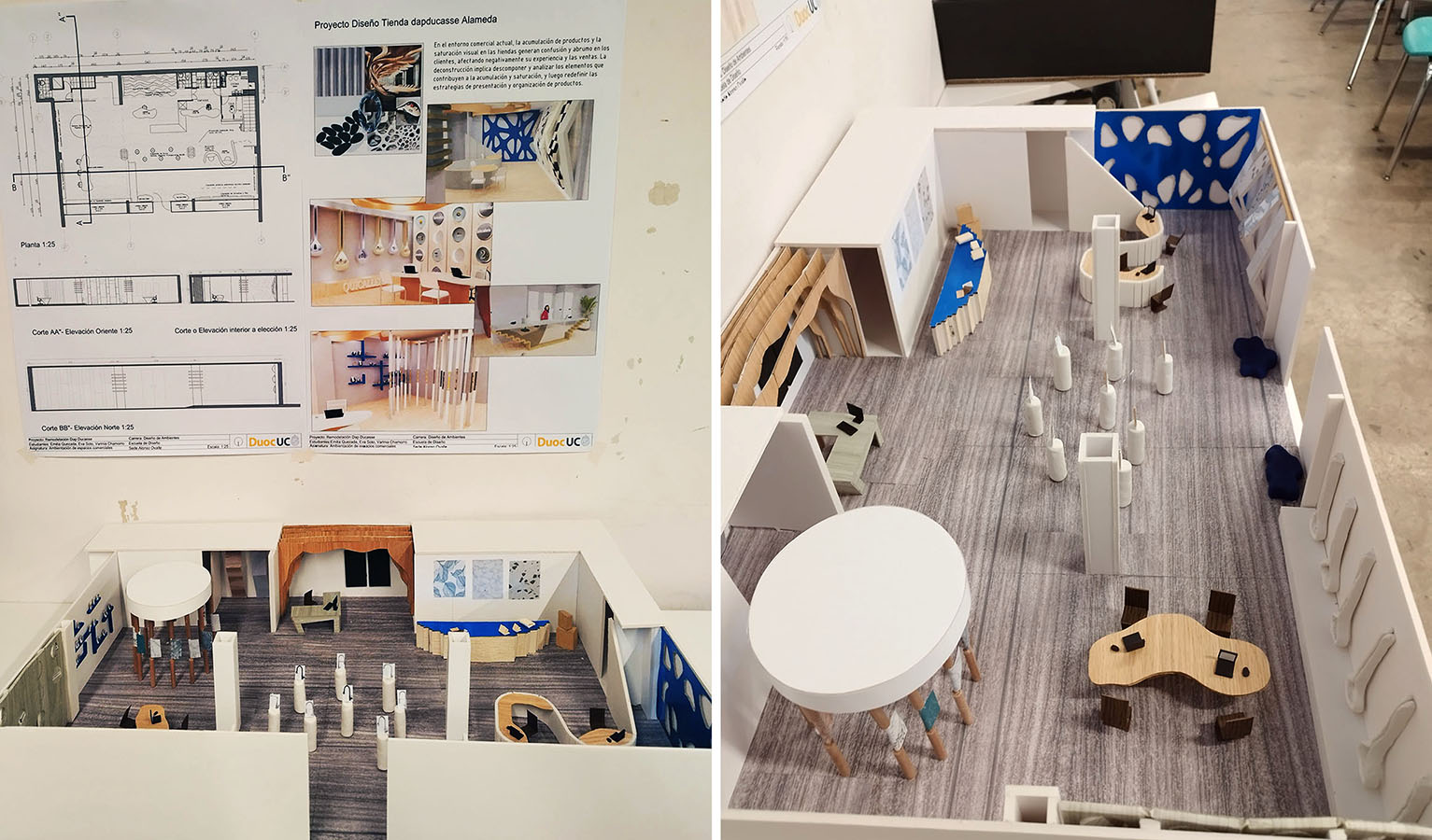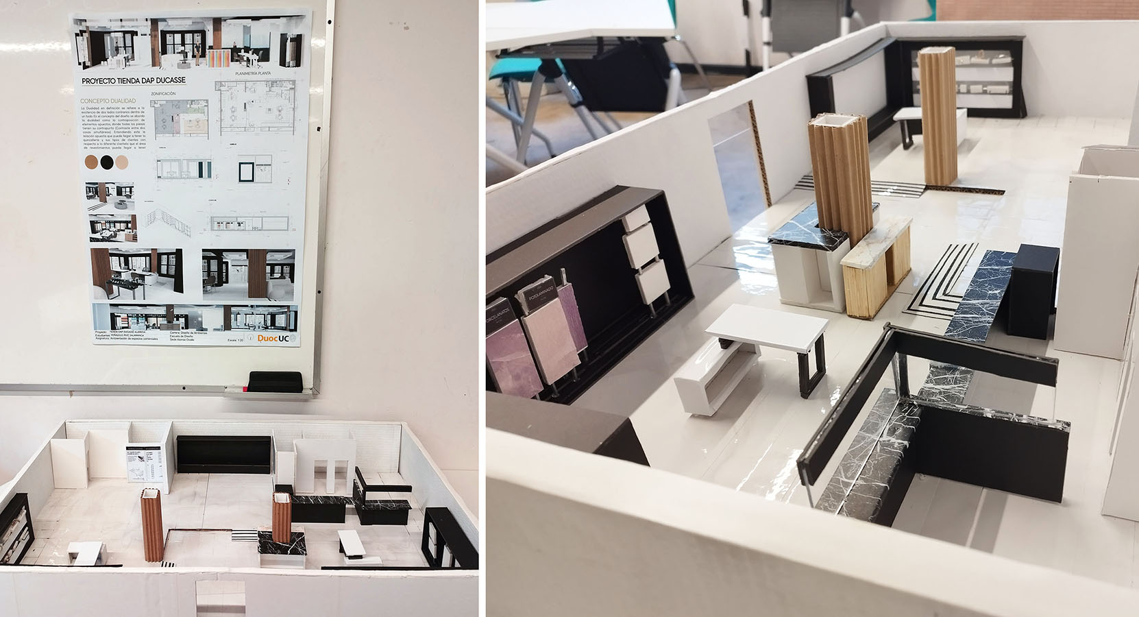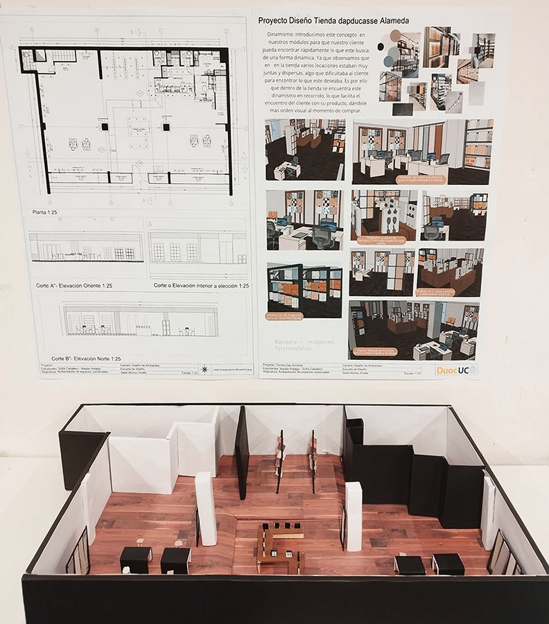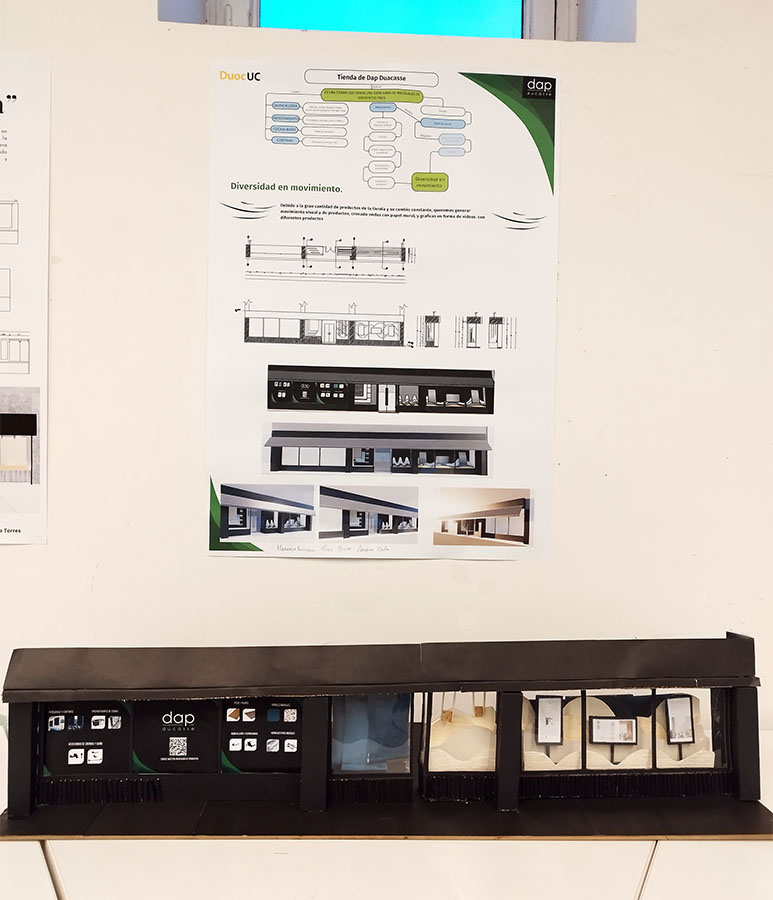 Desarrollar soluciones de ambientación de espacios, considerando requerimientos funcionales, técnicos y tendencias. El Diseño actual de la Tienda Dap Ducasse Alameda, cuenta con muchas intervenciones en el tiempo, que no tienen un denominador común, y es por esto que consideramos necesario proponer un diseño de ambientes nuevo, en base a un concepto que, trabajado en detalle, entregue la posibilidad de aumentar las ventas de la tienda, mejorando la exposición de los productos y la experiencia del cliente. Los estudiantes tendrán la oportunidad de trabajar con todos los tipos de productos en exposición de la tienda Dap Ducasse, como por ejemplo: quincallería, cerámicas, porcelanatos, pisos fotolaminados, SPC, Atroguard, Deck y pasto y apeles murales.