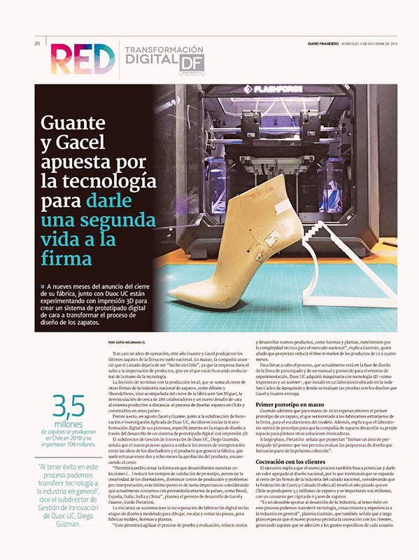 Sistema de Diseño y Fabricación Digital para la Industria del Calzado Nacional en alianza con Guante-Gacel. El Sistema de prototipado rápido basado en la fabricación digital para la industria del calzado nacional en alianza con Guante-Gacel, es un proyecto que busca a través del modelado y la impresión 3D apoyar y agilizar los problemas que se pueden generar en el intercambio de muestras y contramuestras con los productores en China, India o Brasil así como también dar más herramientas de venta y marketing mejorando la visualización de los productos.
