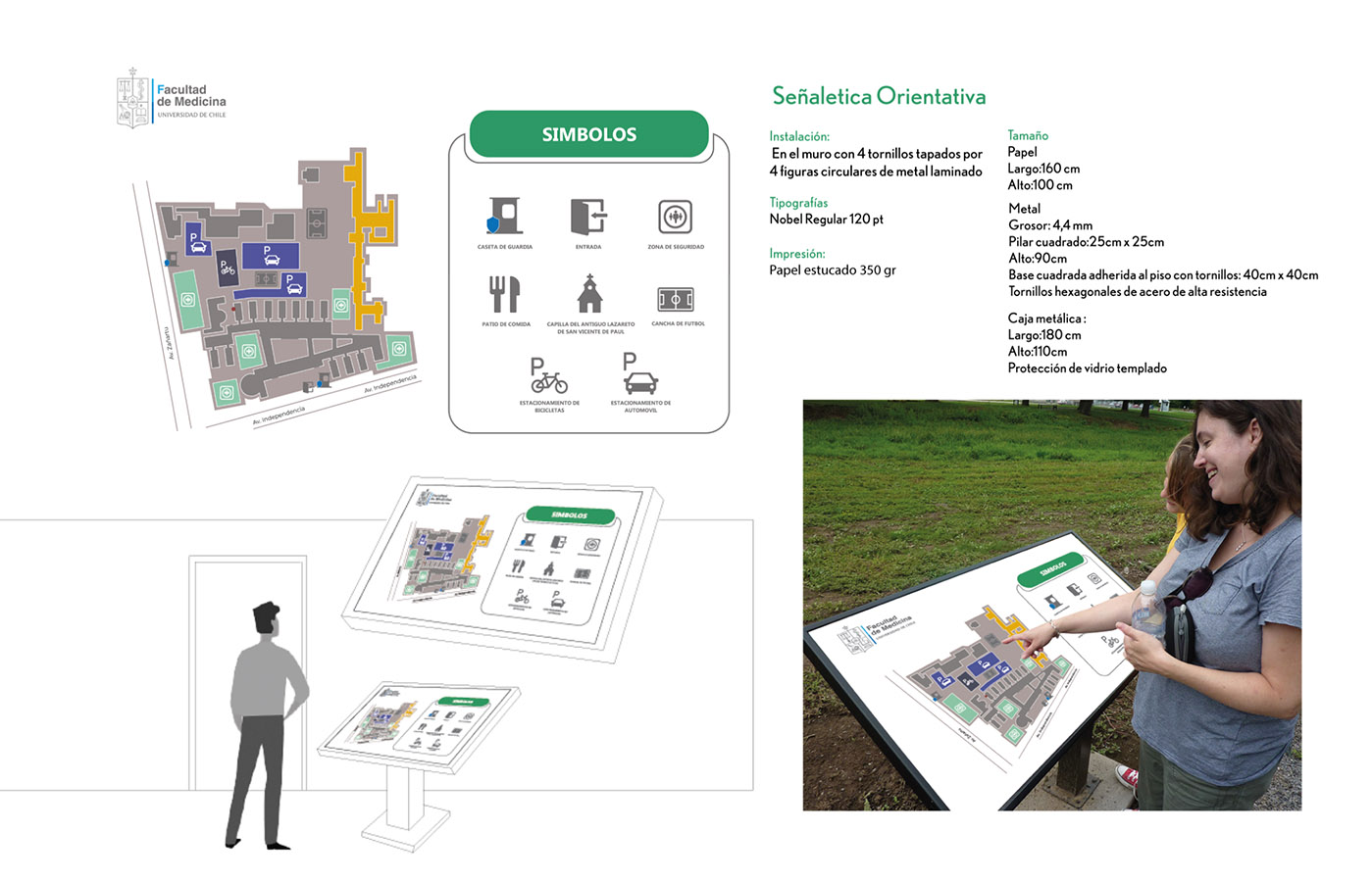 Los estudiantes desarrollan un Proyecto de Wayfinding para la Facultad de Medicina de la Universidad de Chile, donde se tienen consideraciones identitarias y de Arquigrafía para renovar su actual sistema de señalización.