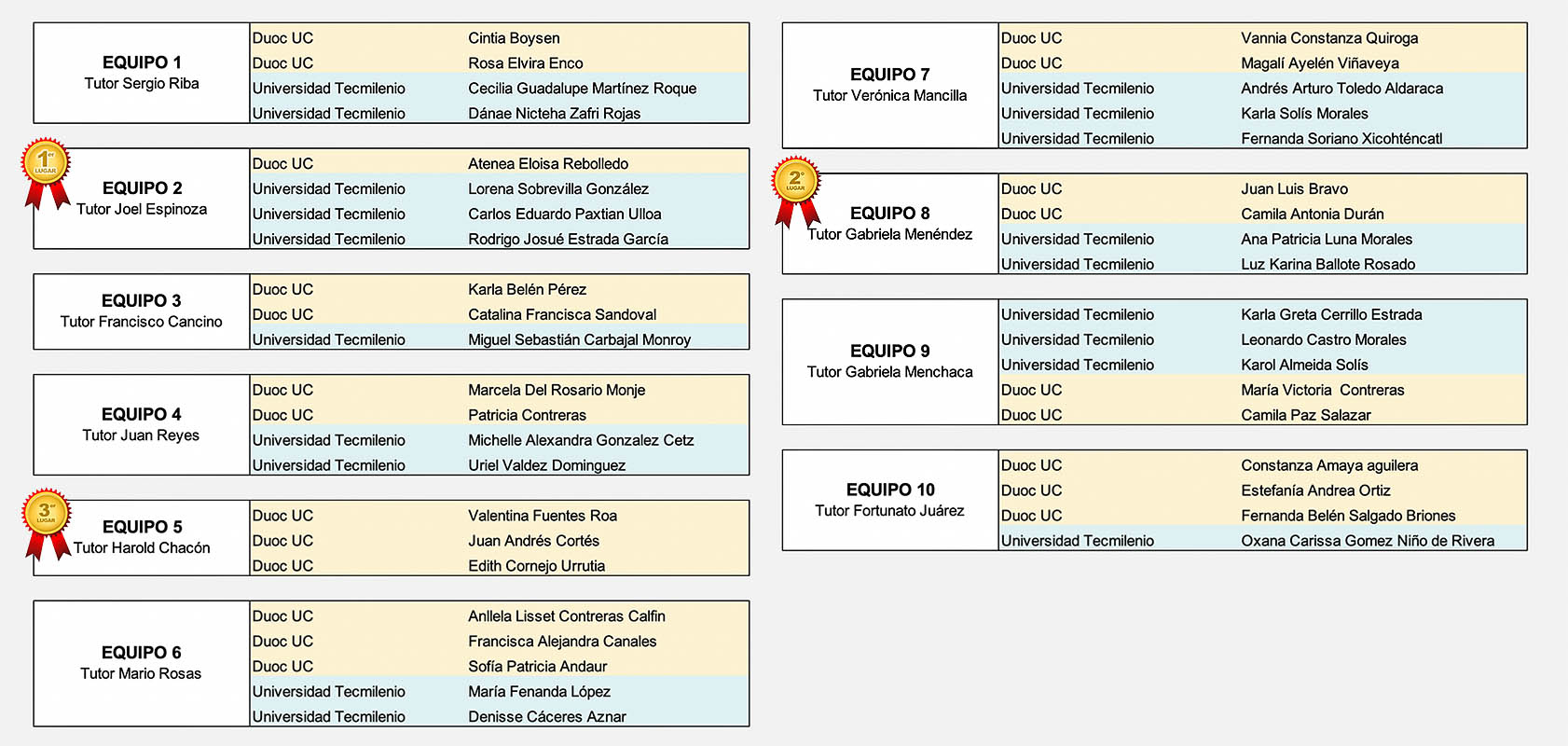 34 ESTUDIANTES: CHILE, DUOC UC: Cintia Boysen, Rosa Elvira Enco, Atenea Eloisa Rebolledo, Karla Belén Pérez, Catalina Francisca Sandoval, Marcela Del Rosario Monje, Patricia Contreras, Valentina Fuentes Roa, Juan Andrés Cortés, Edith Cornejo Urrutia, Anllela Lisset, Contreras Calfin, Francisca Alejandra Canales, Sofía Patricia Andaur, Vannia Constanza Quiroga, Magalí Ayelén Viñaveya, Juan Luis Bravo, Camila, Antonia Durán. MÉXICO, UNIVERSIDAD TECMILENIO: Cecilia Guadalupe Martínez Roque, Dánae Nicteha Zafri Rojas, Lorena Sobrevilla González, Carlos Eduardo Paxtian Ulloa, Rodrigo Josué Estrada García, Miguel Sebastián Carbajal Monroy, Michelle Alexandra González Cetz, Uriel Valdez Domínguez, María Fenanda López, Denisse Cáceres Aznar, Andrés Arturo Toledo Aldaraca, Karla Solís Morales, Fernanda Soriano Xicohténcatl, Ana Patricia Luna Morales, Luz Karina Ballote Rosado