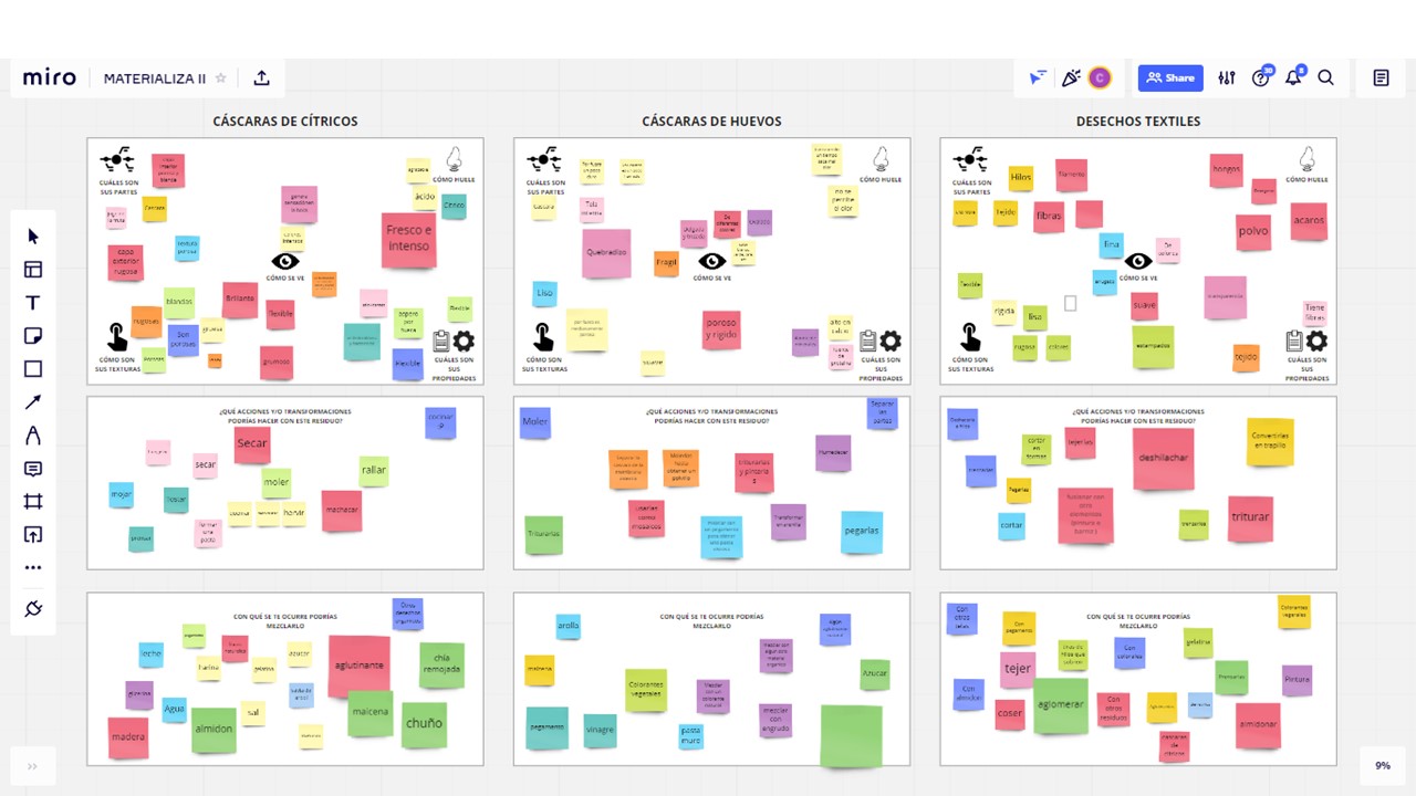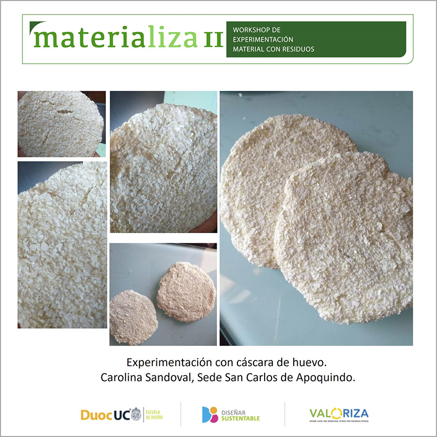 Materializa II es la segunda versión de este Workshop 100% online de experimentación a partir de residuos, consistente en 2 jornadas de trabajo online más trabajo de experimentación individual de cada participante en su casa entre sesiones. En esta versión los participantes inscritos (de diversas sedes y carreras de la EDD) trabajaron en uno o más de los 3 residuos abordados: cáscaras de cítricos, cáscaras de huevos y desechos textiles. En la segunda sesión se compartieron y analizaron los resultados obtenidos. El Workshop se enfocó en enseñar algo más a los participantes sobre sustentabilidad, sobre materiales y el paso a paso para explorar y experimentar con materiales de desecho, y a evaluar y a valorar las propiedades de los resultados.