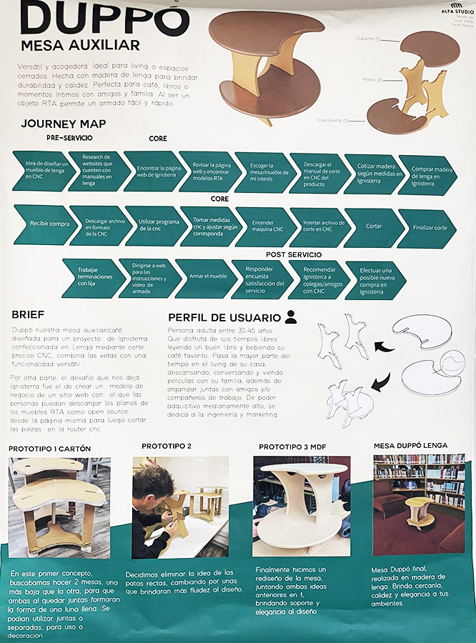 PRESENTACIÓN FINAL: Entregables esperados por los estudiantes: • Mapa de la Experiencia del Usuario (Journey Map) con la estructura visual del servicio. • Producto físico fabricado en madera lenga para testeo. • Tutorial en video que explique cómo armar el producto.