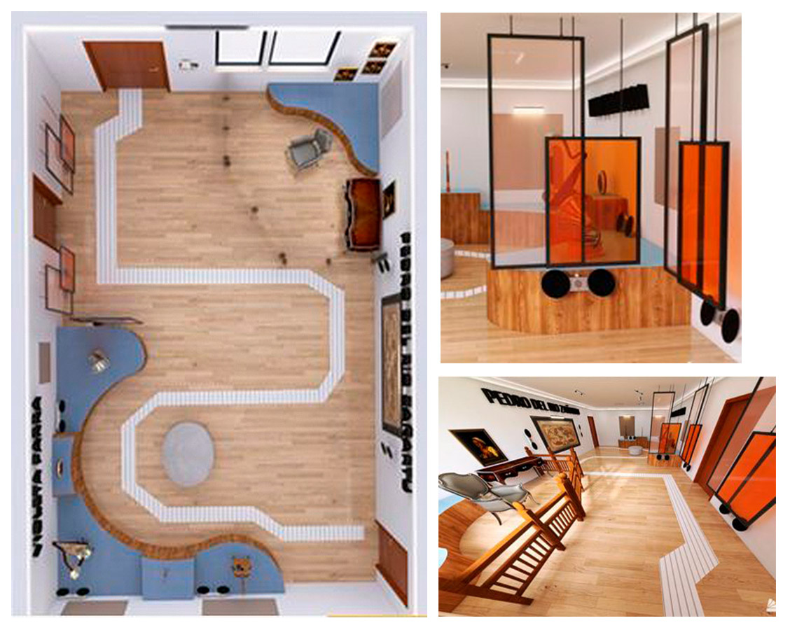 El Proyecto está enmarcado en vinculación con el medio con el Parque Museo Pedro del Río Zañartu de la ciudad de Concepción. Este Proyecto involucra distintas temáticas y dentro de ellas está el encargo de realizar un montaje para la muestra de Violeta Parra en el salón de inicio del Museo. El diseño realizado consideró aspectos relevantes por parte del Museo como conservar la identidad de este respecto de su arquitectura, casa patronal, así como las condiciones de preservación de los objetos a exhibir pertenecientes a la Folclorista Chilena, para luego abordar la antropometría, ergonomía y normativas de espacios de uso público. Finalmente, los estudiantes luego de realizar el proceso de diseño crearon una distribución espacial y mobiliario que organiza y contiene la muestra de la Folclorista en su paso por la ciudad de Concepción, que permite que los visitantes participen de esta de manera confortable y accesible para que todos disfruten de lo expuesto.