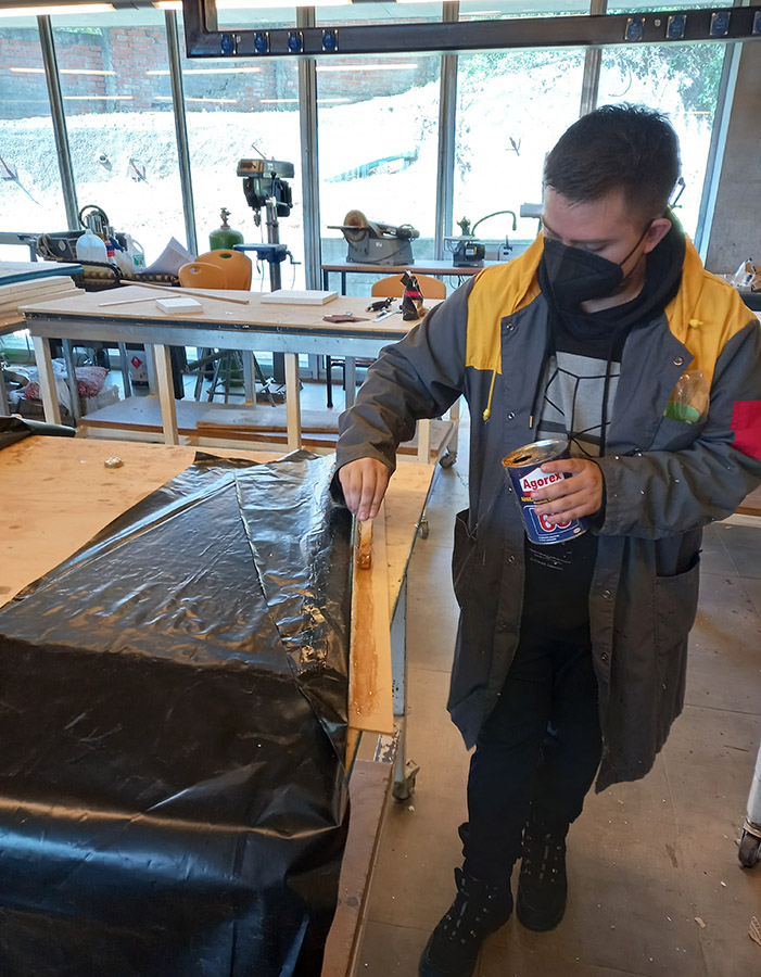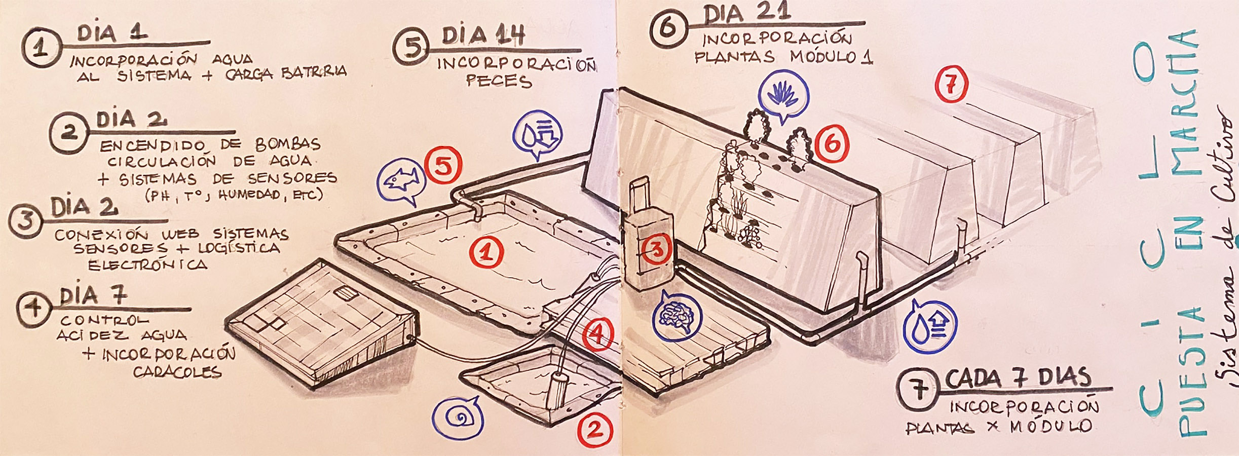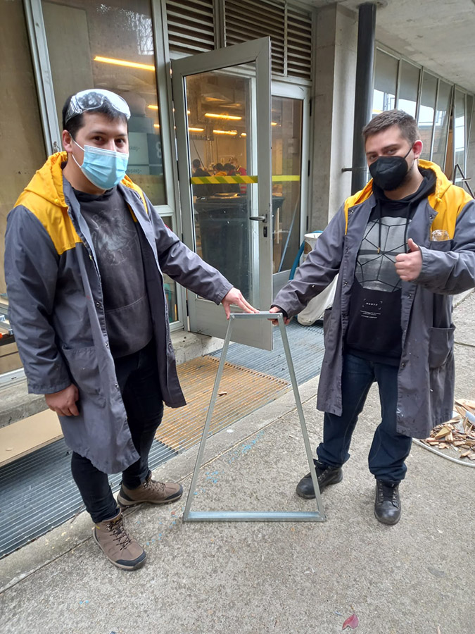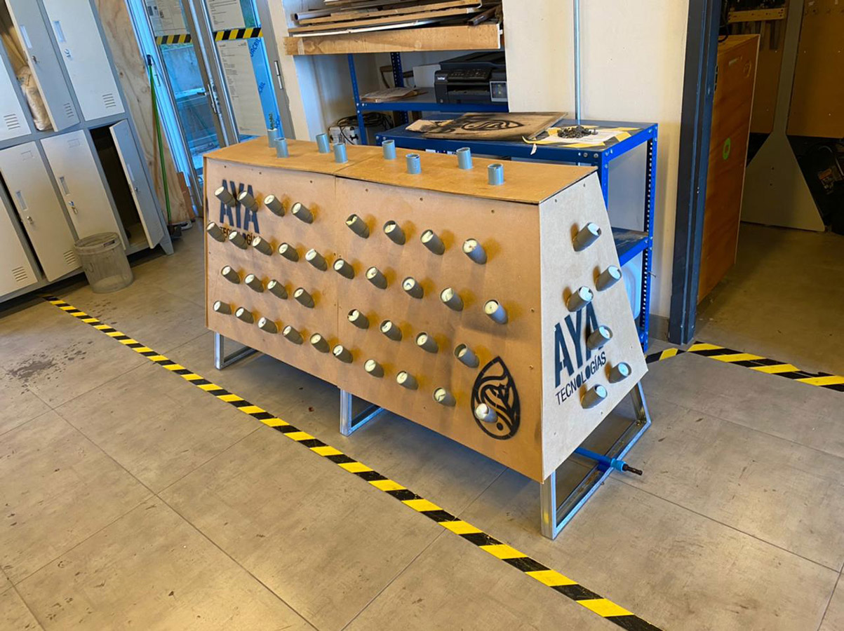 El año 2021 fue un año desafiante según los objetivos planteados por el equipo. En primer lugar, reducir el volumen del caballete para abarcar mayor cantidad de cultivo en un espacio reducido y/o adaptar el sistema a todo tipo de terreno. Para ello, debíamos plantearnos las magnitudes y frecuencias en las que el sistema alimentaria biomasa vegetal y animal, cubicar el material en específico que se utilizaría, prototipar los caballetes para entender los procesos de manufactura y generar material audiovisual para la transferencia tecnológica conceptual y física. Partimos generando una ingeniería inversa de los componentes del sistema prototipado en la etapa anterior en Lonco. Esto nos permitió identificar los aspectos a mejorar en relación a materialidades, sistemas de anclaje, distribución de componentes, técnicas de manufactura, comportamiento del cerebro como interfaz, ciclo del agua, comportamiento de biomasa vegetal y animal, y mantenimiento del mismo, para posteriormente pasar a la etapa de definición de aspectos a mejorar. Con el desafío de realizar transferencia tecnológica a Pirque, comenzamos a desarrollar un Dossier técnico en que para futuras publicaciones, en el cual se detallaría ¿Qué es el Proyecto AYA?, descripción de los componentes del sistema para la comprensión del funcionamiento de este, información respectiva al cultivo, explicación de la toma de decisiones en relación a la elección de peces, elementos para el mantenimiento, etc. Los esfuerzos antes mencionados, tenían como objetivo ayudar en la manufactura del sistema, con esto nos determinamos a manufacturar los componentes en nuestra escuela utilizando a Cerebro ya testeado en Lonco. Gracias al trabajo realizado por nuestros estudiantes se construyeron 8 caballetes completos, utilizando máquinas eléctricas manuales y estacionarias, tecnología CNC y herramientas manuales. Todo esto quedó documentado y resumido en 5 videos que explican en detalle todo el proceso de armado de los componentes, además de un amplio registro fotográfico de todo el proceso. Satisfactoriamente, se envió todo lo pactado con Pirque, todo el sistema reducido a un palet, lo cual nos recordó los primeros croquis realizados en la génesis del proyecto, en el que se soñaba con llegar con un palet al lugar en conflicto. Esto nos permite seguir soñando con llegar a cumplir con el objetivo primario.