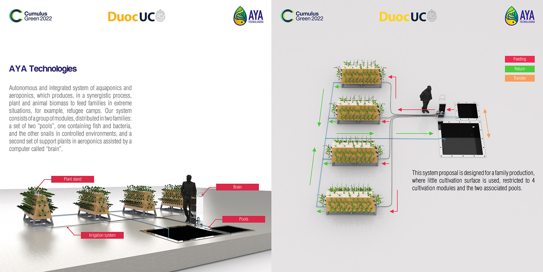 En esta quinta etapa, nos determinamos en realizar definiciones concretas en las técnicas de armado y configuración del sistema, considerando no solamente la manufactura de este, sino también, definiendo a nivel comunicacional como hacer el traspaso de información para todos los usuarios involucrados, usuarios gestores, usuarios comunicadores y usuarios manufactureros. En este proceso debimos trabajar metodologías de Design Thinking centrando todos nuestros esfuerzos en los usuarios que serían parte del proceso y gestión, traspasando barreras de carácter idiomática y de contexto sociocultural donde se emplazaría el sistema. Gracias a al permanente feedback y asesoría del docente Pablo Melzer con las entidades Ayuda en Acción y Wap Consulting Group se pudo ir realizando levantamientos de información relevantes para tomar decisiones en relación a la configuración de suelo del sistema, alimentación, dimensionado y armado de este. La tarea se centró en la realización formal de documentos y prototipos que dieran un alto nivel de detalle de dimensionado de componentes en relación a la realidad que se vive en Etiopía en cuanto a la adquisición de insumos y materiales para la posterior manufactura del sistema. Para ello el equipo Chile, junto al gran trabajo de nuestro alumnos colaboradores, logramos diseñar 2 manuales, uno de dimensionado y otro de armado de componentes, utilizando material gráfico simple, en el que a través de vectores con siluetas humanoides, logramos comunicar gestos, posturas y movimientos de una persona para la construcción del sistema. La variedad de dialectos e idiomas que hablan en Etiopía nos planteaba el desafío de evitar al máximo la asistencia de algún texto, en ello, resolvimos este desafío logrando formalizar los documentos para un posterior impreso o descarga en algún dispositivo móvil. Gracias al desarrollo de más material gráfico, postulamos al concurso de Cumulus Green, concurso que invita a diversas entidades a nivel mundial a presentar sus proyectos de diseño que están aportando con los Objetivos de desarrollo sostenible de la ONU, concurso en el cual satisfactoriamente logramos mención honrosa entre los cientos de proyectos aspirantes al premio. Actualmente, AYA se encuentra en etapa de implementación en Etiopía esperando seguir soñando con cumplir las metas planteadas en las etapas primarias del proyecto, generar “cultivo de alimentos en zonas de catástrofes y campos de refugiados”.