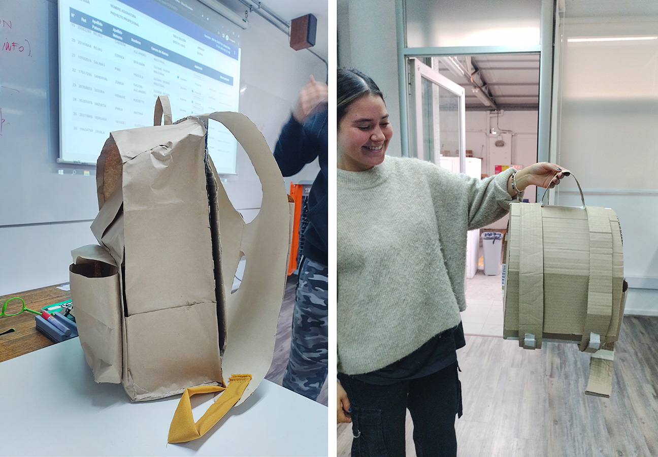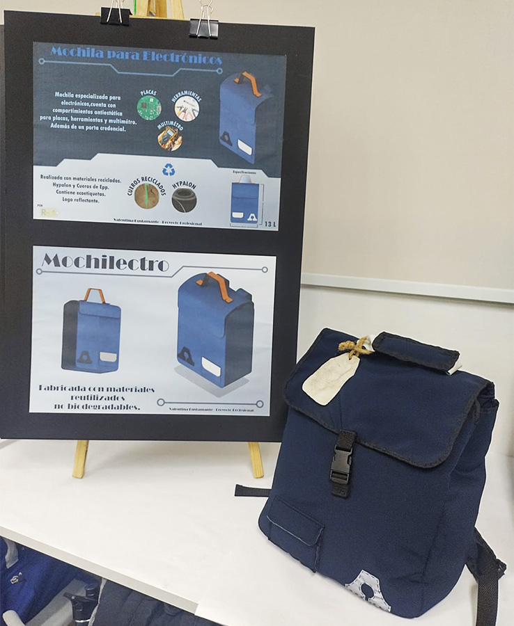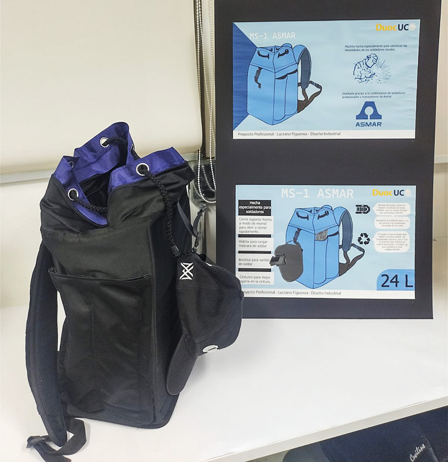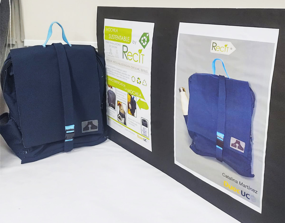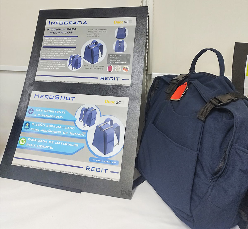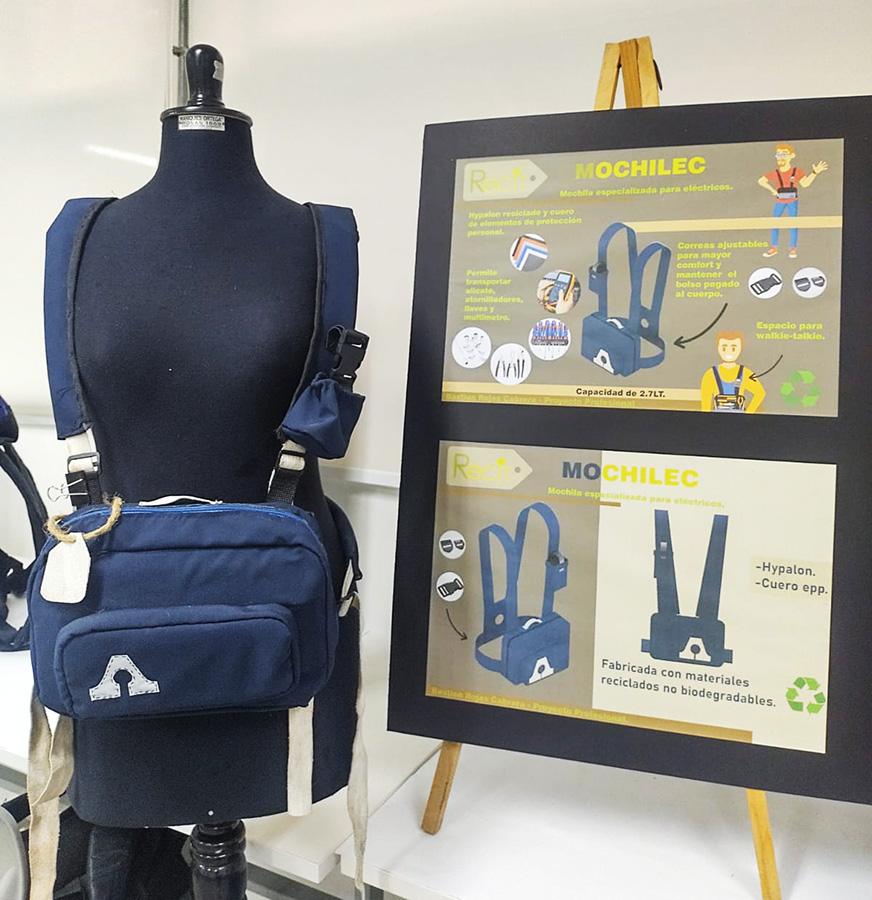 Proyecto de reutilización de desechos del textil utilizado para construir balsas. Los estudiantes utilizaron Hypalon, material no biodegradable, para diseñar línea de equipaje para personal de la misma empresa, ASMAR (Astilleros y Maestranzas de la Armada).