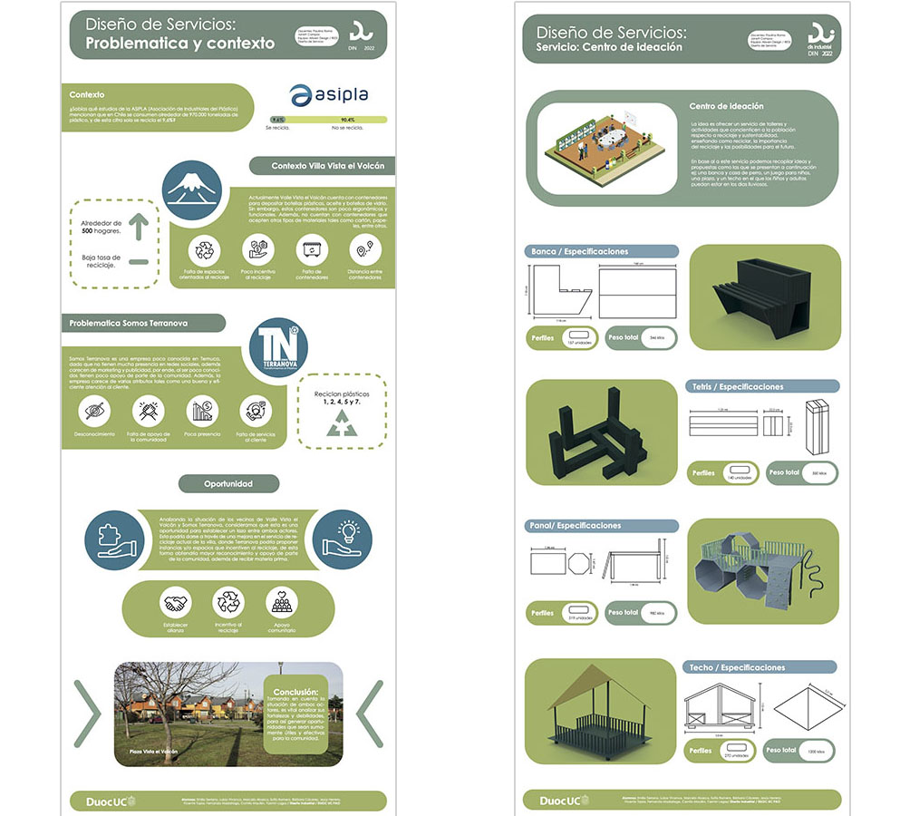 Somos Terranova, es una empresa revalorizadora de plásticos, ubicada en la Región de la Araucanía en la ciudad de Temuco, fue fundada el año 2018 como un Proyecto social en apoyo a la comunidad, dando una nueva vida a los residuos plásticos a través de perfiles de plástico reciclado utilizados mayormente en cercos y mobiliario público. Es así como nace Recicla Temuco con el fin de vincular a los alumnos de Diseño Industrial, con la empresa y la comunidad de la Región de la Araucanía, en donde los alumnos realizarán propuestas de diseño de servicios que articulen de manera sustentable y vinculen a la comunidad recicladora con la empresa revalorizadora para generar proyectos comunitarios en apoyo a los espacios públicos de los residentes.