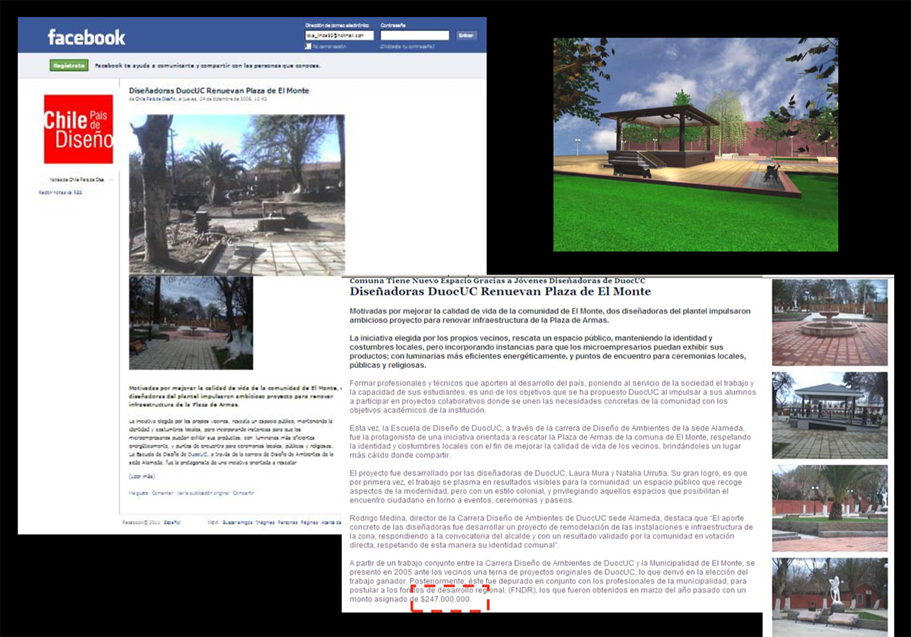 En colaboración con Ilustre Municipalidad de El Monte, desarrollamos 3 propuestas de Rediseño de La Plaza de El Monte. En Teatro Carrera de la comuna se presentaron las propuestas a 87 personas junto al Alcalde y Consejo Municipal quienes votaron por una de ellas para ser materializada. Posteriormente, y en conjunto con ingeniero civil del municipio la propuesta elegida fue depurada y presentada al Fondo Nacional de Desarrollo Regional (FNDR), instancia que aprobó la propuesta aportando $247.000.000 de pesos para su construcción. Hoy podemos decir que la Plaza de El Monte fue íntegramente diseñada por nuestras exalumnas Laura Mura y Natalia Urrutia, bajo la guía de docente Pablo González.