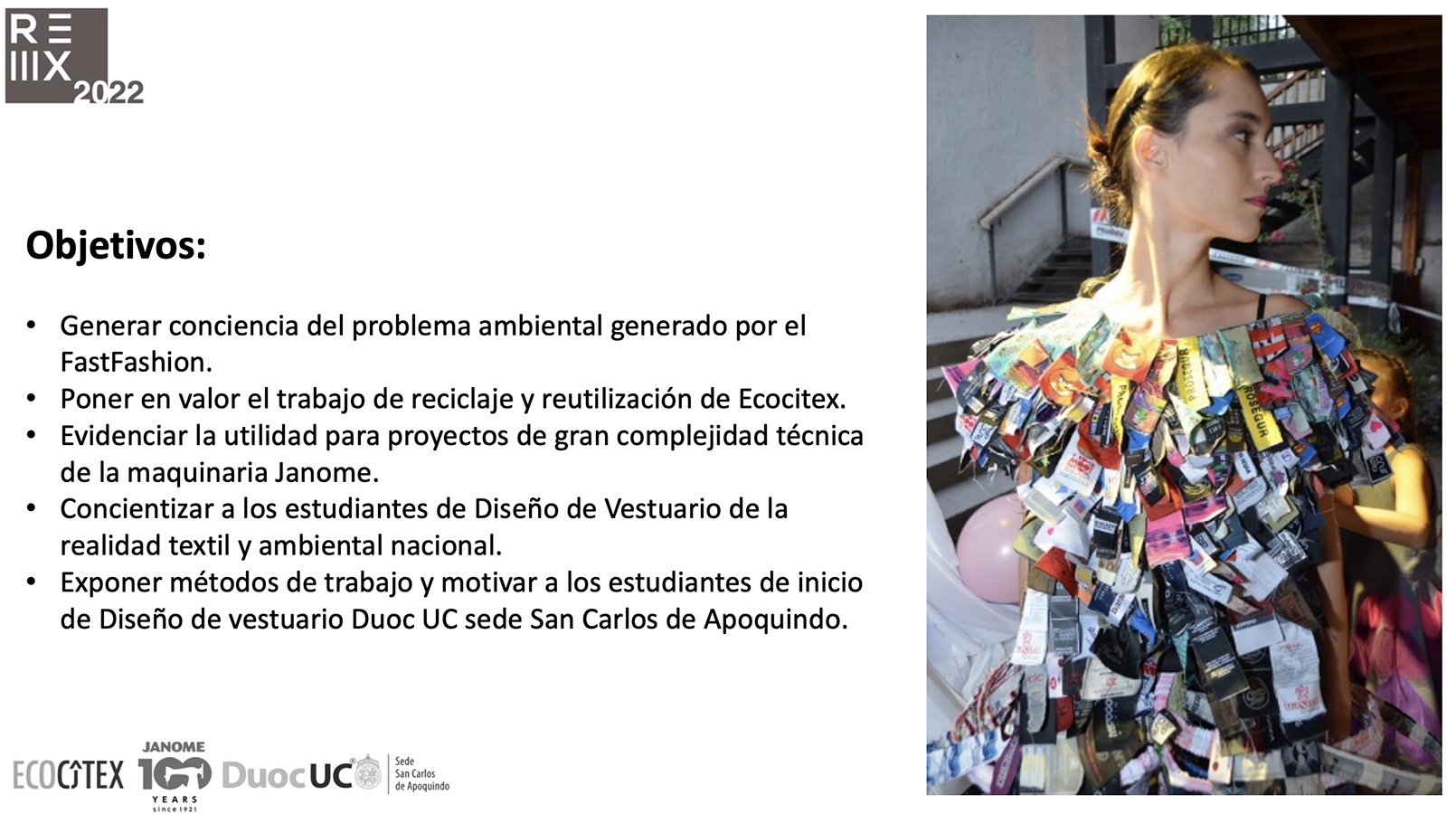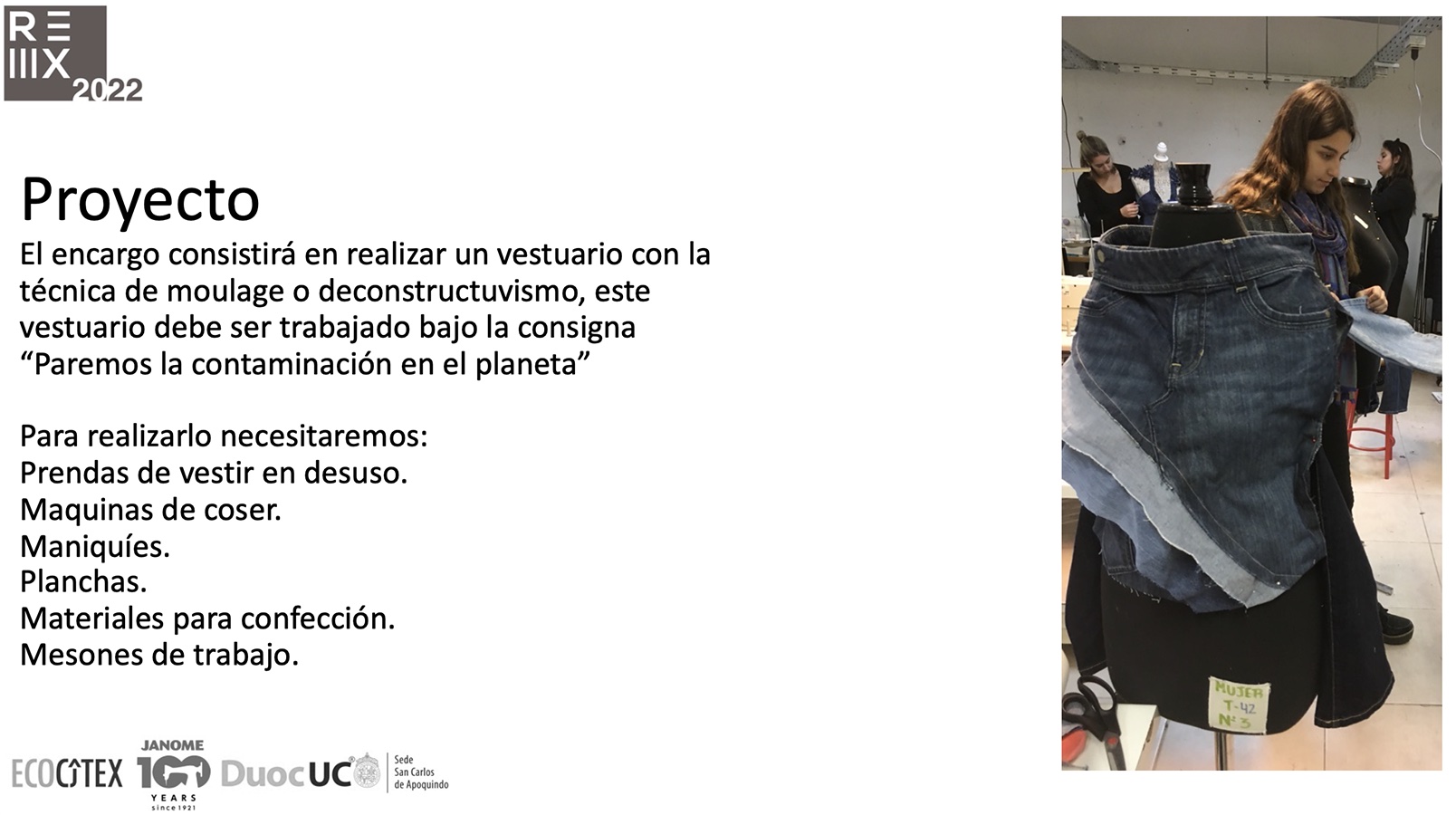 Proyecto que busca generar conciencia del problema ambiental producido por el FastFashion, poniendo en valor el trabajo de nuestros estudiantes con técnicas de reciclaje y reutilización de la empresa líder nacional Ecocitex, junto con esto vinculamos a nuestros estudiantes con la empresa japonesa lider en maquinaria semi industrial para la confección con apoyo técnico frente a la complejidad presente en este tipo de productos.